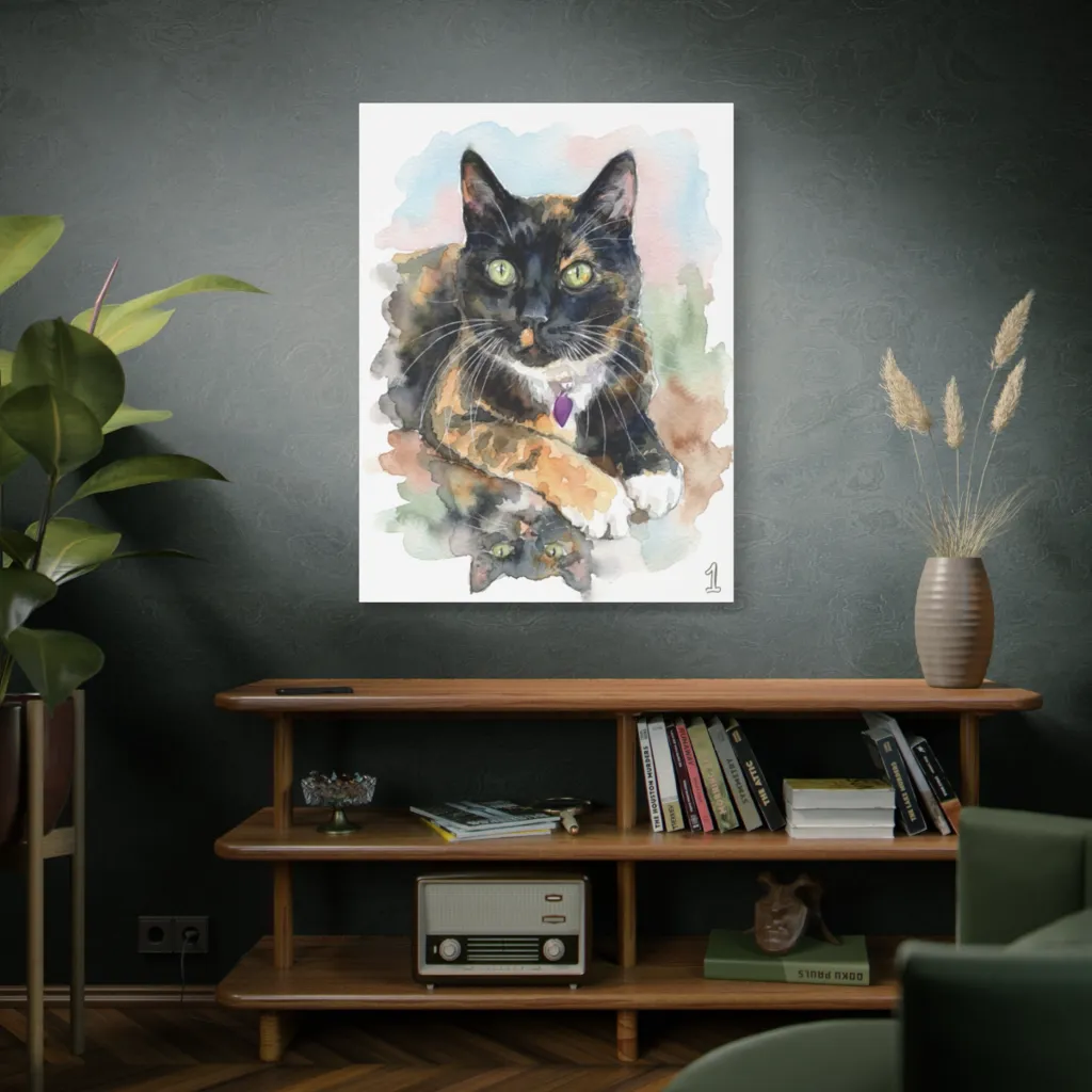 1's piercing green eyes wonderfully convey her watchful soul and unique, intriguing personality. The whimsical reflection adds delightful depth, making her truly special. A heartfelt portrait.