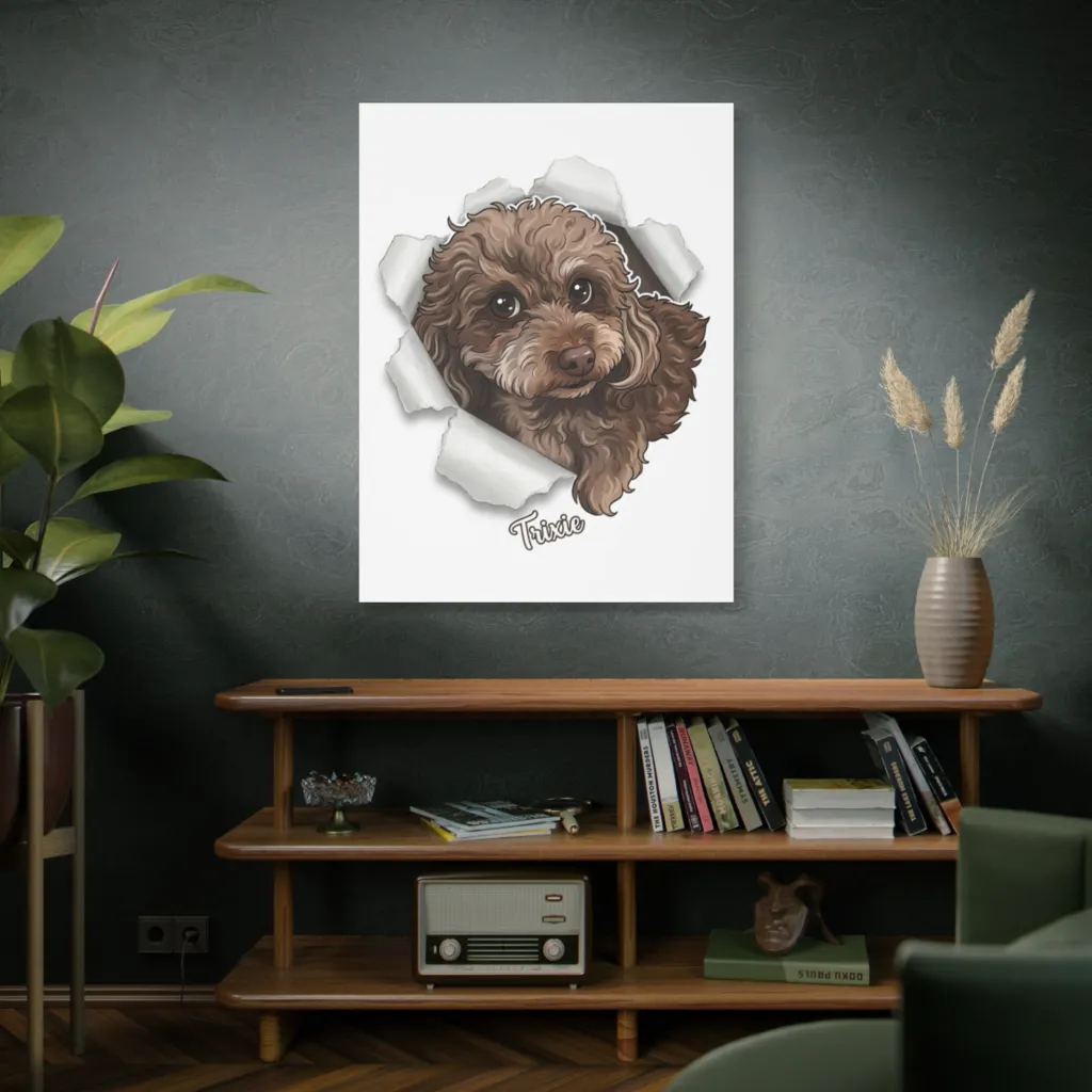 A whimsical digital illustration of a curious brown pup peeking through torn paper, bursting with adorable, mischievous charm.