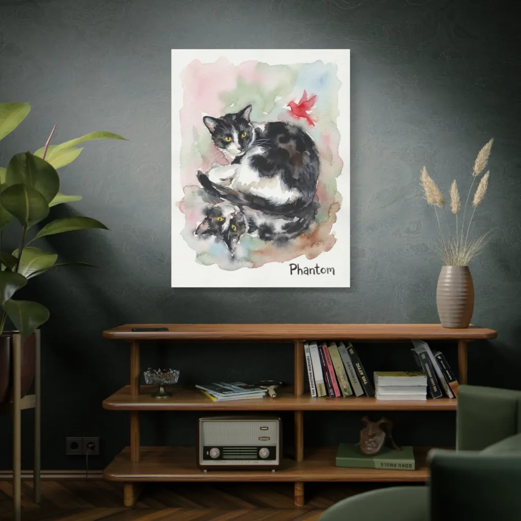 A whimsical watercolor captures two curious tuxedo cats amidst soft washes, contemplating a vibrant red bird with quiet charm. Phantom's playful presence doubles in this watery world, perhaps dreaming of that fleeting red bird.