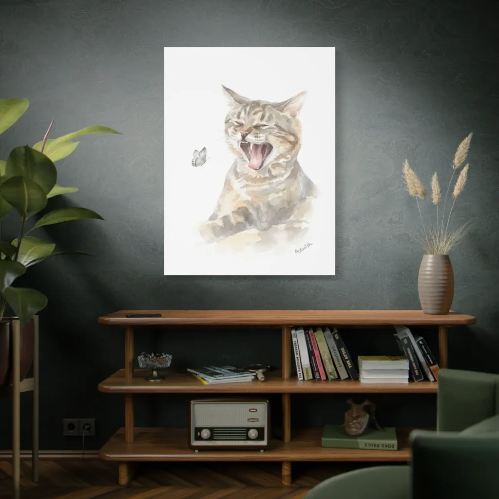 A delightful watercolor captures a massive feline yawn, humorously oblivious to a tiny butterfly, creating a moment of whimsical, sleepy charm.