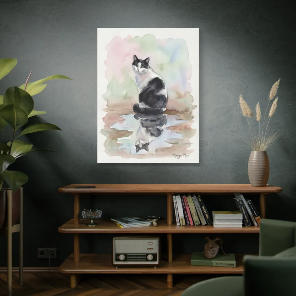 Soft watercolor washes depict a sleek tuxedo cat with emerald eyes, coolly eyeing its whimsical reflection amidst a serene, dreamy backdrop. Maggie Mae clearly believes she’s twice as photogenic, elegantly pondering her own stunning reflection.