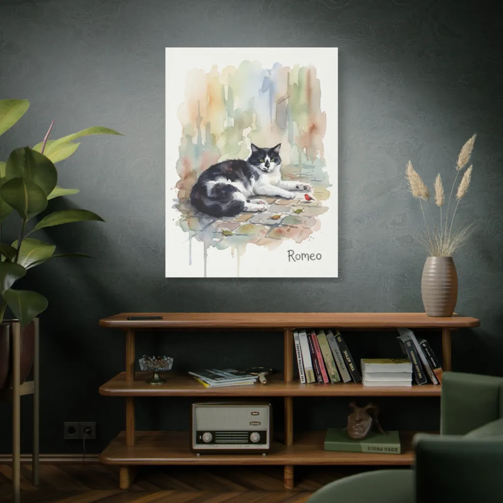 "A Romeo Reverie" exhibits a masterful tonal harmony; watercolor's evocative wash juxtaposes the cat's stoic geometry. A visceral, avant-garde homage to street-side dignity. Clearly, a profound commentary on feline existentialism.