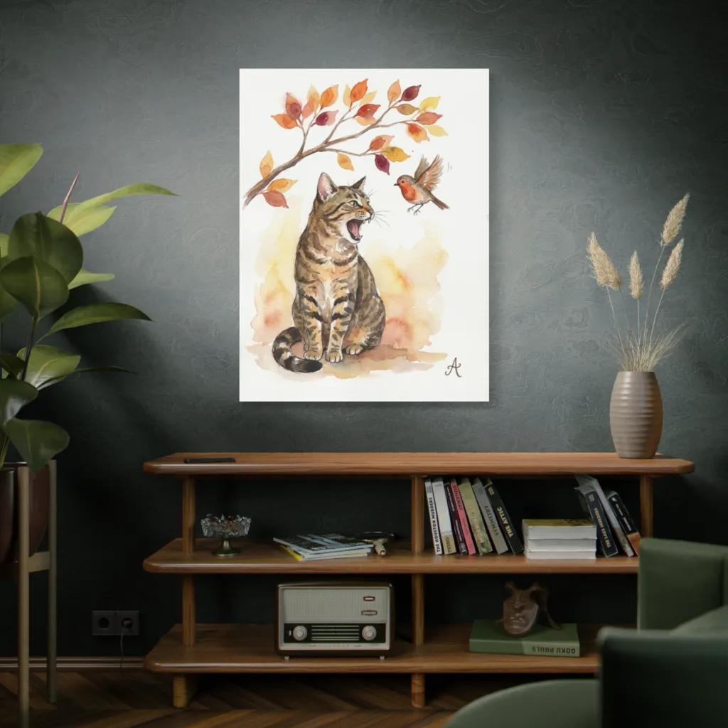 This piece radiates joyful, playful energy. The autumn palette and chaotic humor create an uplifting, spirited vibe. Daily, it would bring a delightful sense of warmth and amusement.