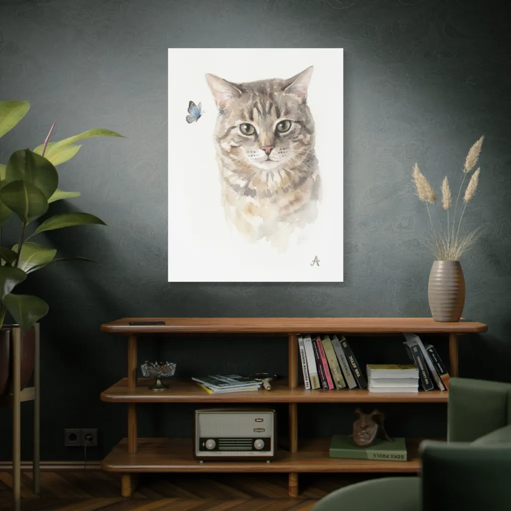 "A's Butterfly Reverie" brilliantly digitizes watercolor's fluidity. This innovative fusion of classic portraiture and contemporary rendering creates a bold, tranquil narrative. A compelling study in modern pet art.