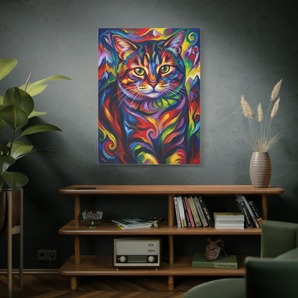 “A’s Prismatic Gaze” belongs above a sleek, raw oak credenza in a modern living space. Its vibrant hues perfectly complement brushed brass accents and soft velvet upholstery, creating an eclectic, inviting focal point. Chic!