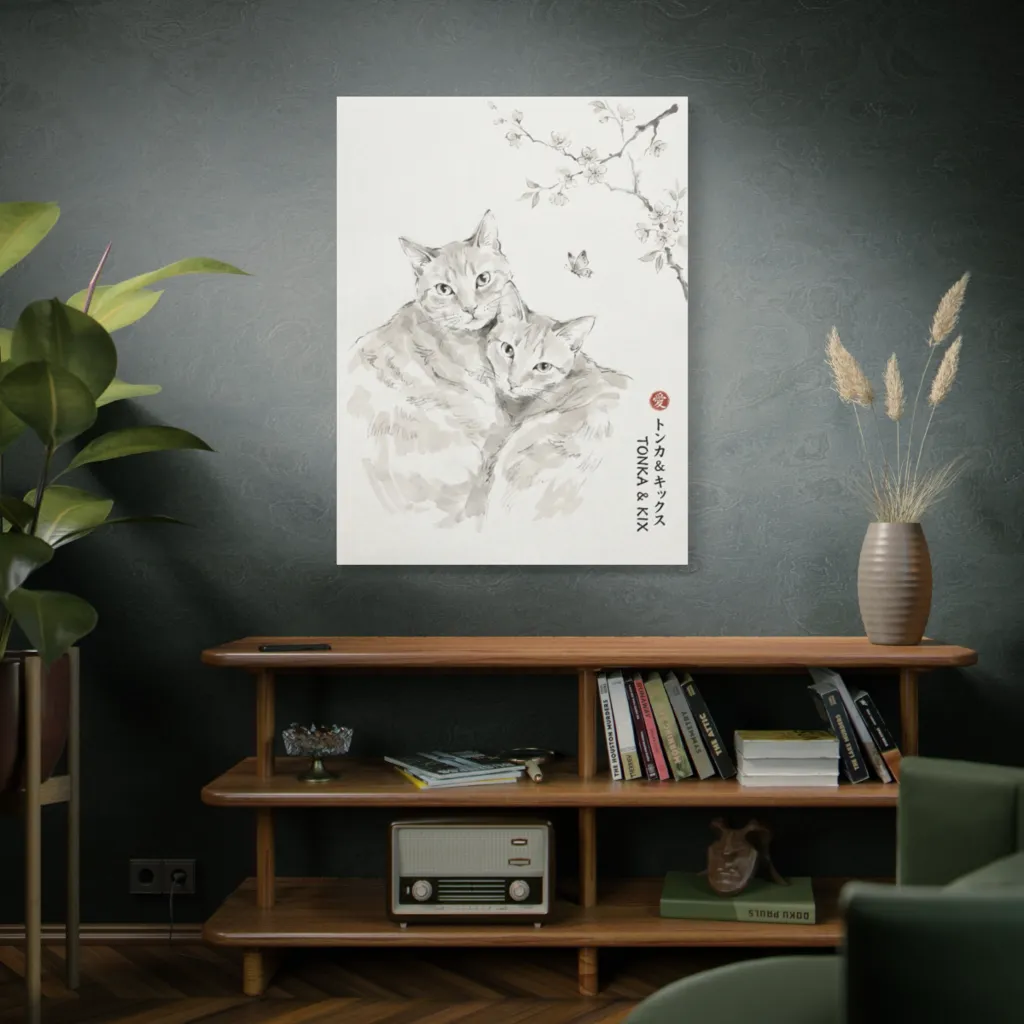 "A Tonka and Kix Reverie" stunningly blends sumi-e elegance with a modern aesthetic. The digital rendition of traditional strokes and serene composition is innovative. A fresh, contemporary take on feline portraiture that truly shines.
