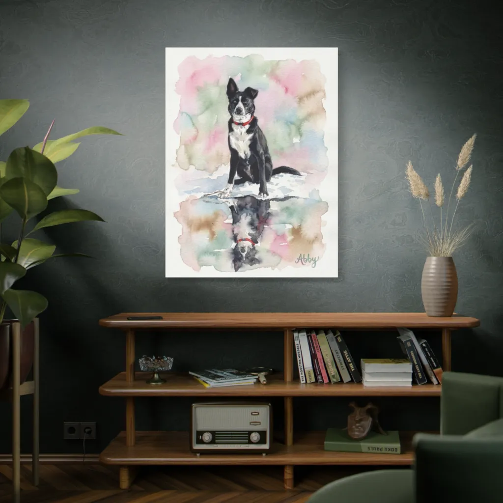 Fluid watercolors portray a distinguished dog and its serene reflection, surrounded by a charming dreamscape of soft, playful washes. Abby, poised and playful, clearly enjoys her perfectly mirrored, watery twin.