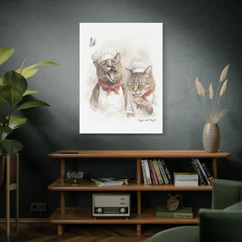 “Aggie and Hazel’s Interlude” would shine in a sun-drenched breakfast nook or above a raw oak console. Its whimsical charm pairs beautifully with brushed brass accents and soft linen textures, creating an inviting, chic focal point.