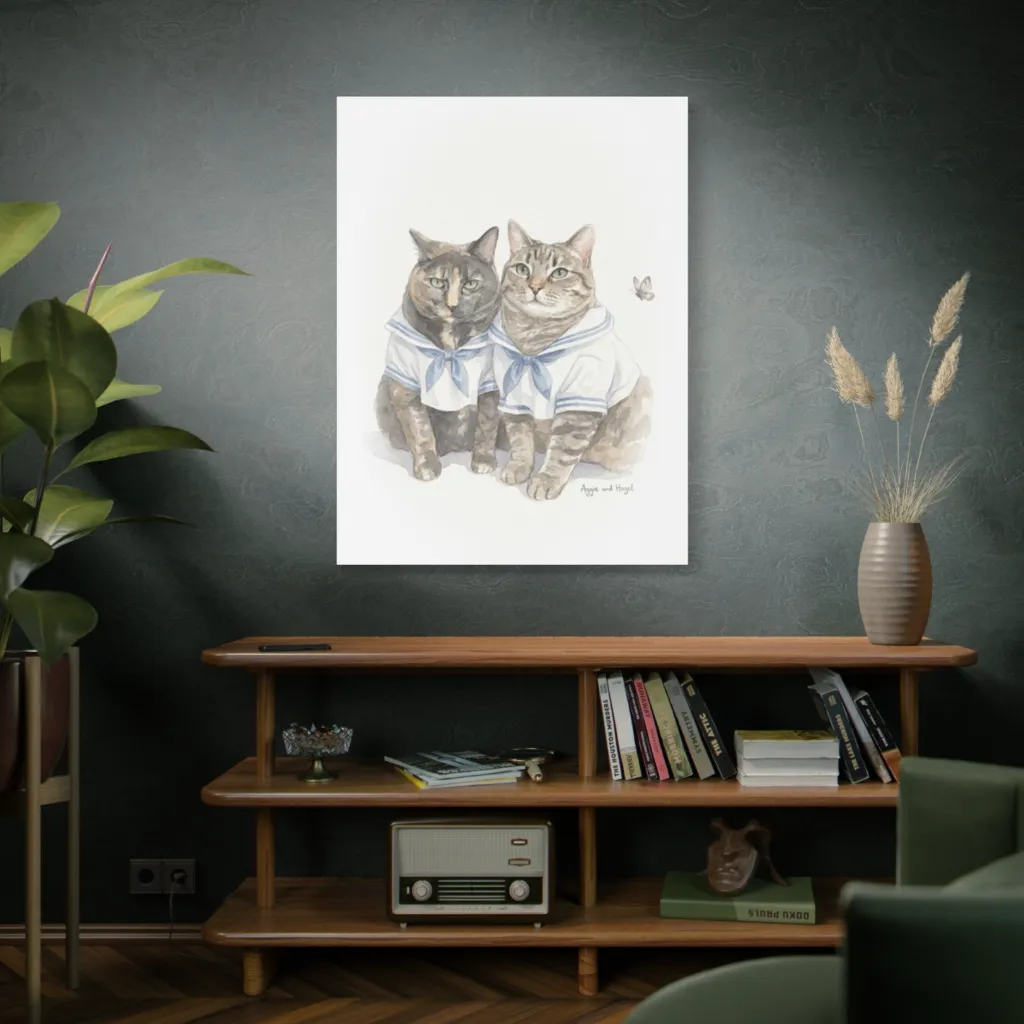 This charming watercolor depicts two cats in adorable sailor suits, exuding a whimsical and gently amused mood.