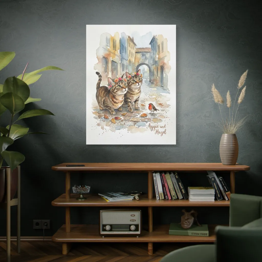 Soft watercolors portray two flower-crowned tabby cats and a curious robin wandering a quaint autumnal street, utterly charming and serene.