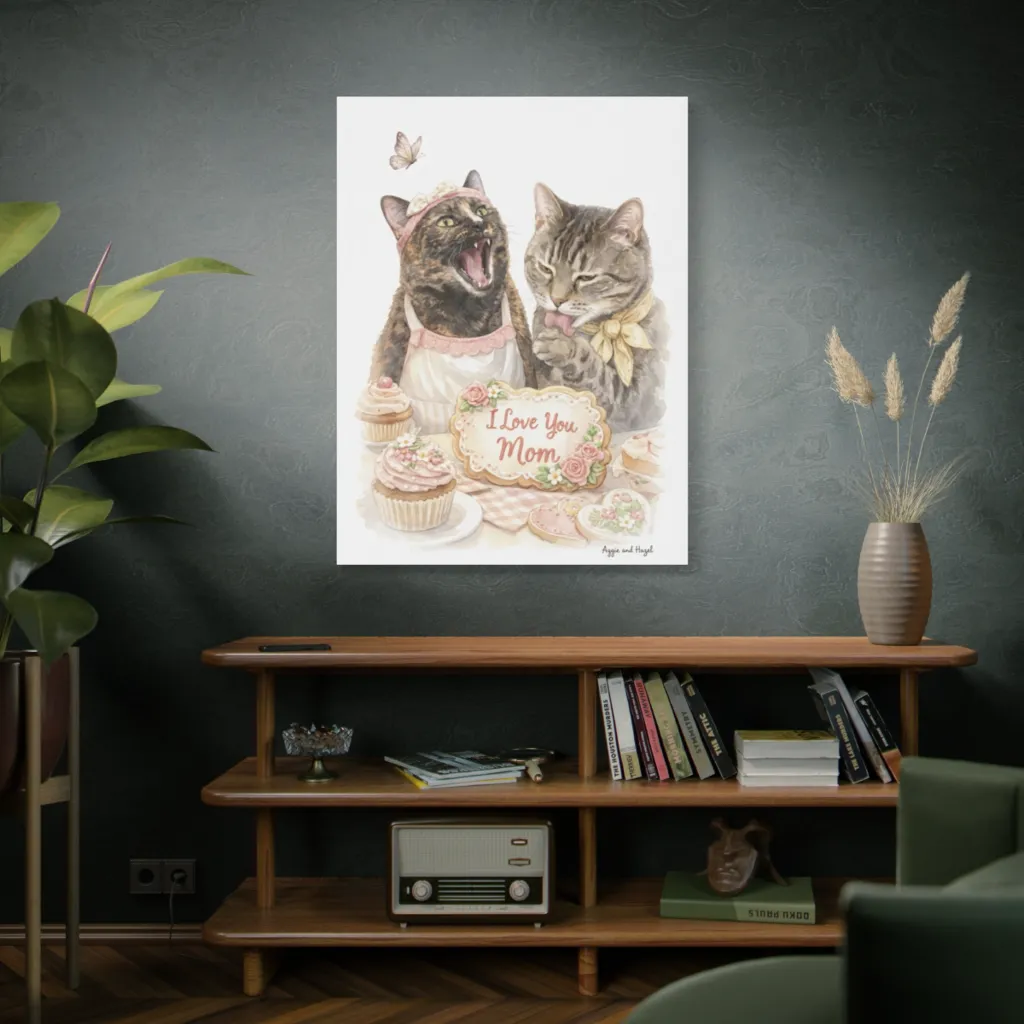 Aggie roars her affection while Hazel primly licks crumbs, a purr-fectly chaotic Mother's Day celebration.