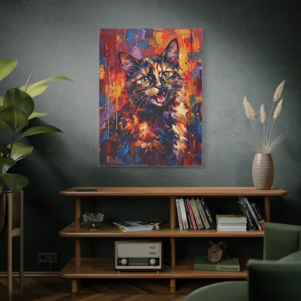 This vibrant impasto portrait captures a feisty tortoiseshell cat mid-yowl, bursting with chaotic energy and vivid, expressive brushstrokes.