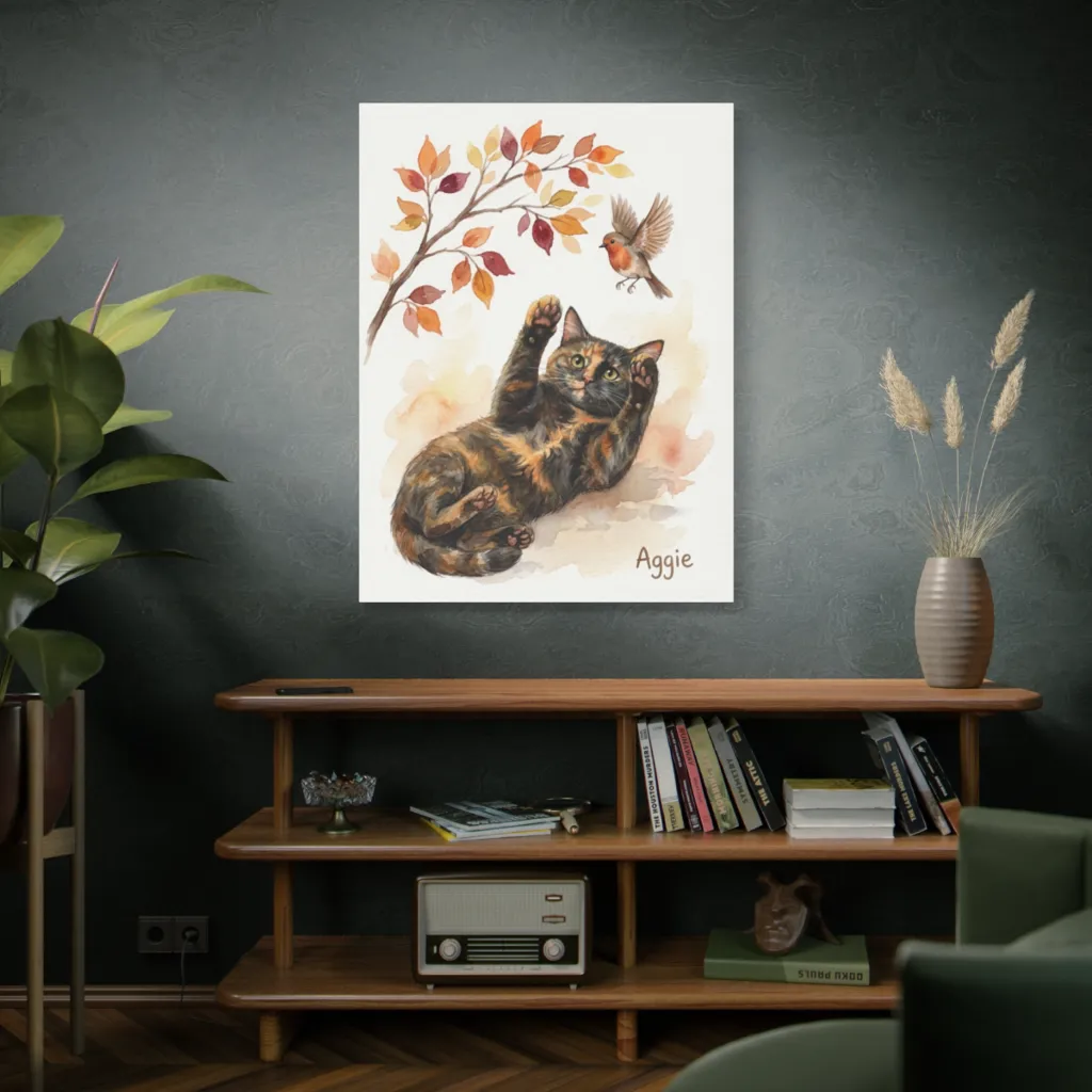A charming watercolor captures a playful tortoiseshell cat reaching for a robin amidst warm autumn leaves, evoking whimsical joy. Aggie, the mischievous tortie, playfully bats at her feathered friend, clearly contemplating a game of chase.
