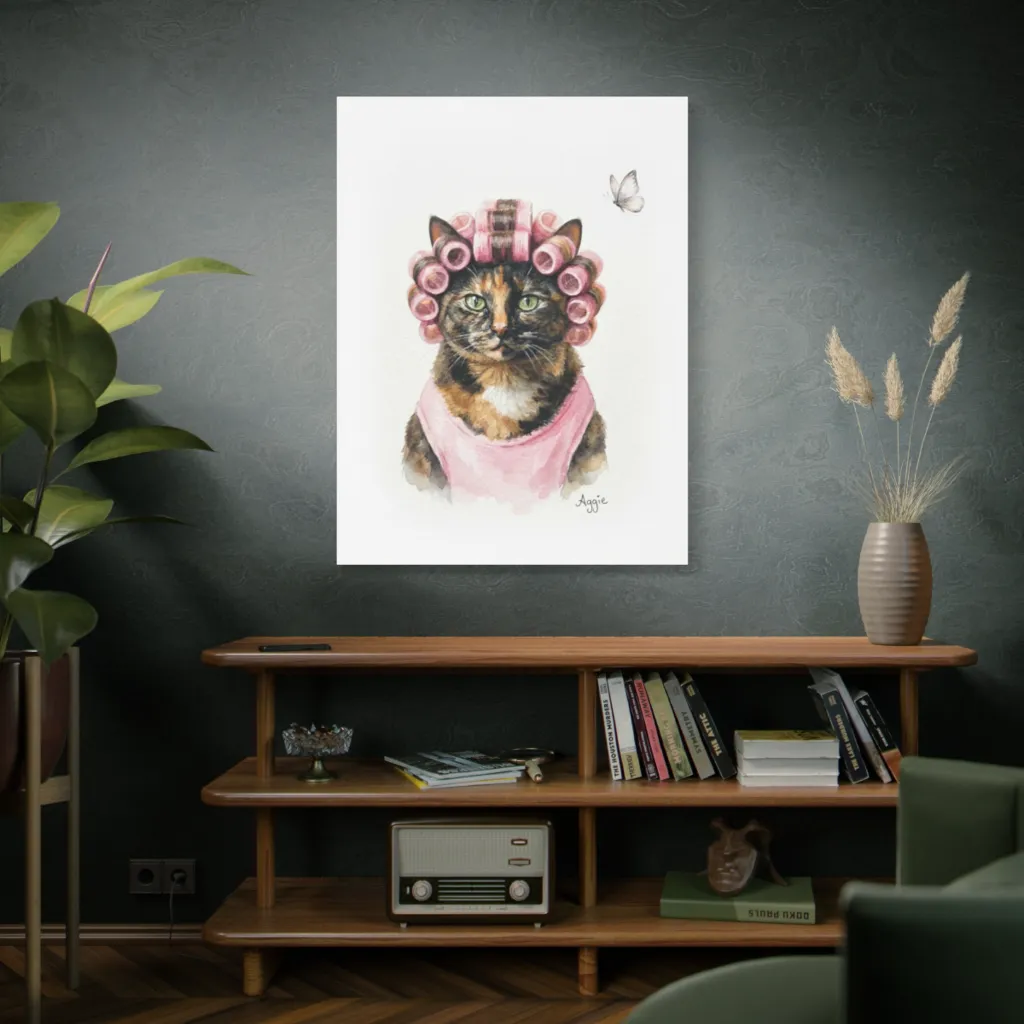 Aggie's prim composure, even with rollers, beautifully captures her unique, elegant spirit. The butterfly gaze reveals a charming, deeper curiosity, perfectly embodying her soulful, distinctive character.