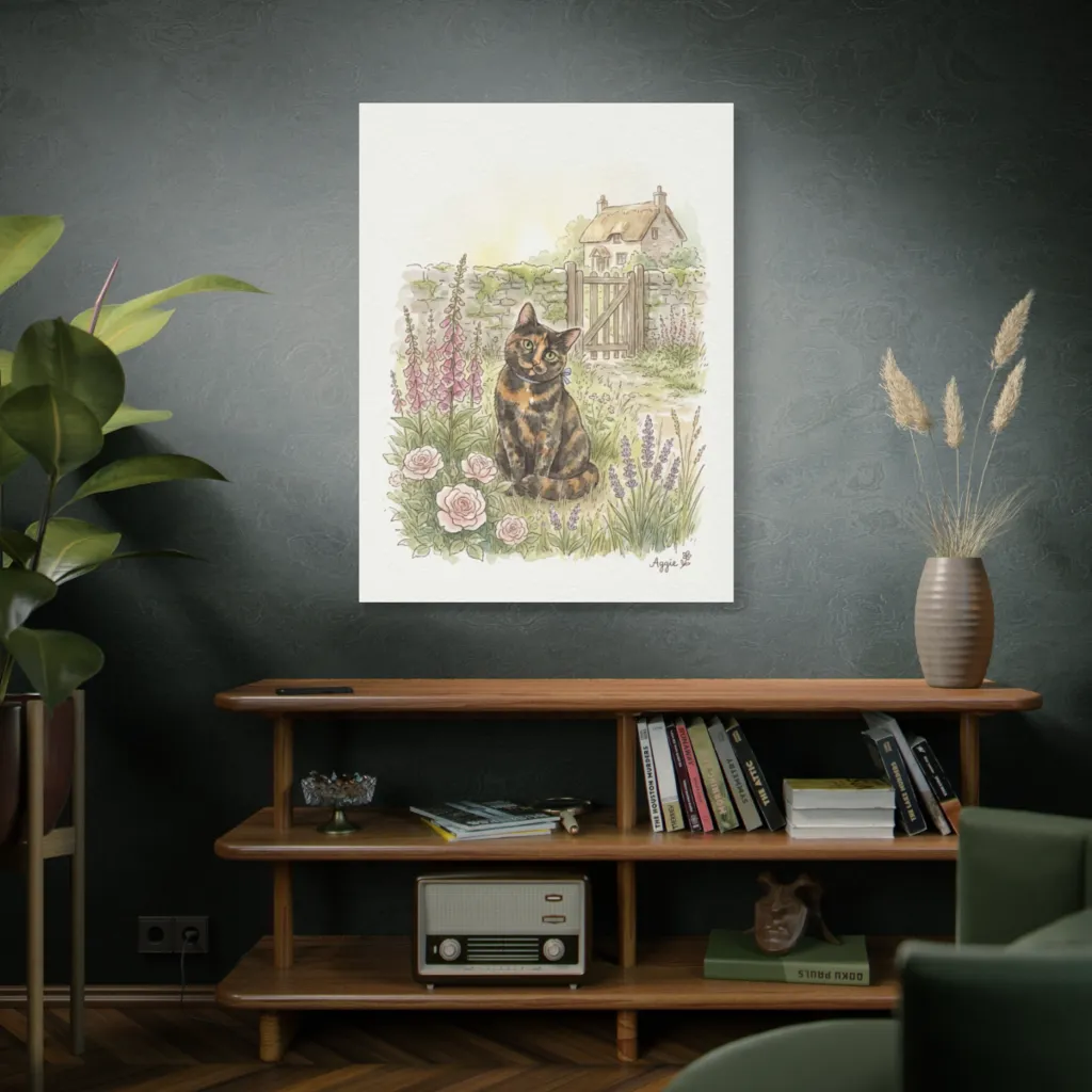 The vibrant warm/cool balance of Aggie's tortoiseshell against verdant greens creates chromatic harmony. Subtle saturation in sun-drenched hues perfectly captures her regal mischief and the garden's idyllic charm. Exquisite color theory at play!