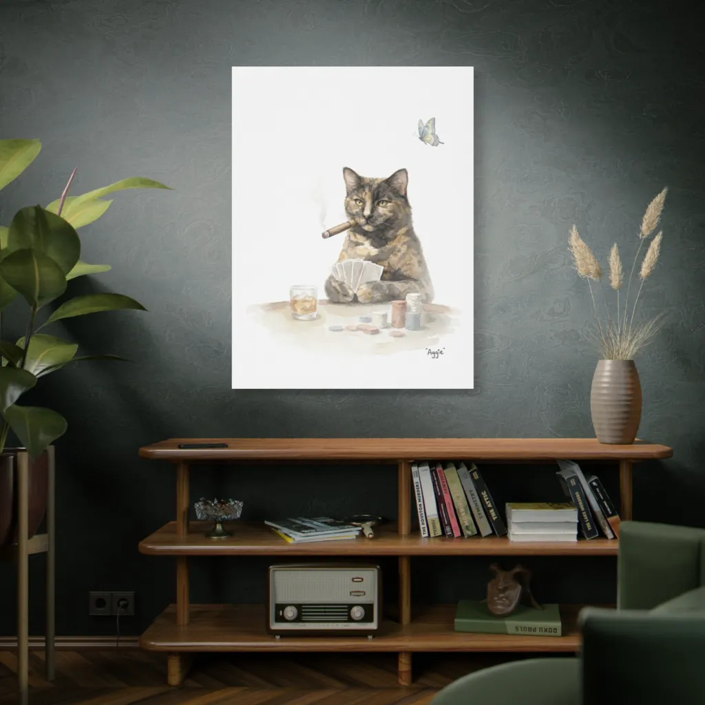 In a whimsical watercolor, Aggie, a sophisticated feline, coolly plays poker with a cigar and whiskey, her mischievous gaze momentarily caught by a butterfly.