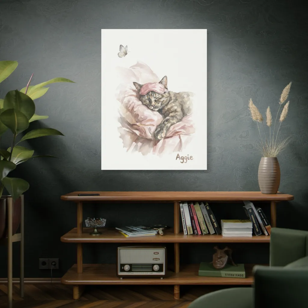 Soft watercolors capture a pampered cat's tranquil slumber on a plush pink pillow, a picture of serene bliss.