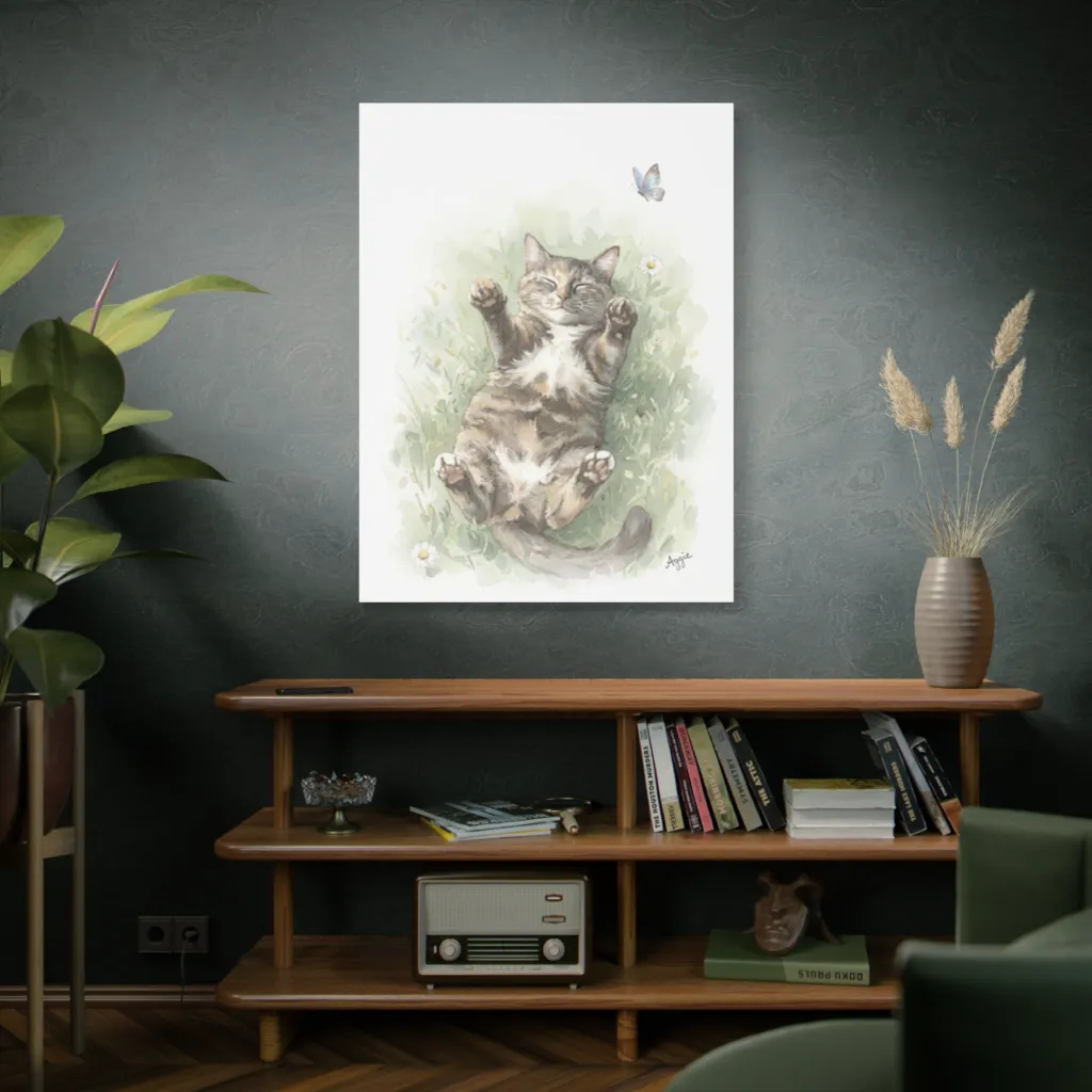 This charming watercolor depicts a blissfully napping cat in soft grass, radiating pure, sun-drenched contentment.