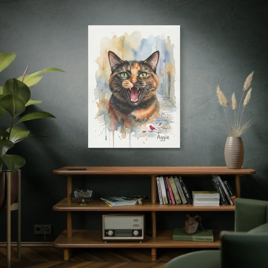 “Aggie's Verdant Call” innovatively bridges traditional watercolor expression with bold, digital-age vitality. The dynamic composition and vibrant palette redefine contemporary pet portraiture, pushing artistic boundaries.