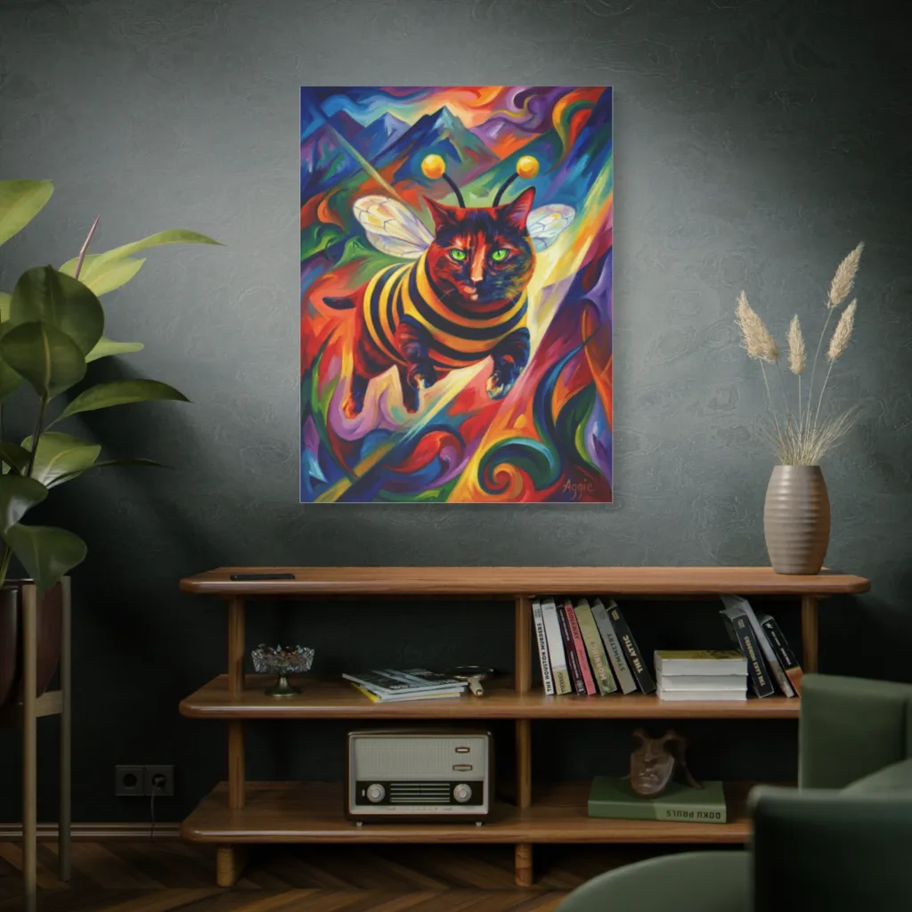 This vibrant, expressionistic piece features a majestic bee-cat leaping through a swirling, polychromatic landscape, evoking a joyfully whimsical and energetic dream.