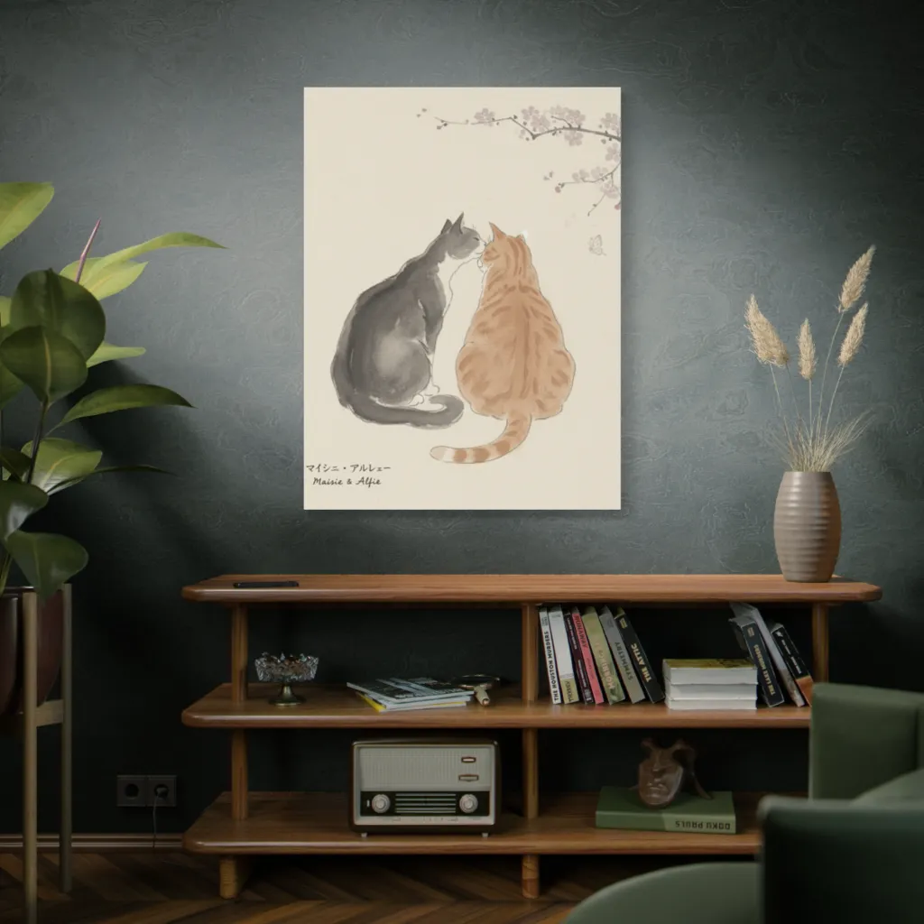 A charming ink-wash captures two felines' tender nuzzle beneath cherry blossoms, a scene of quiet, purr-fect harmony.