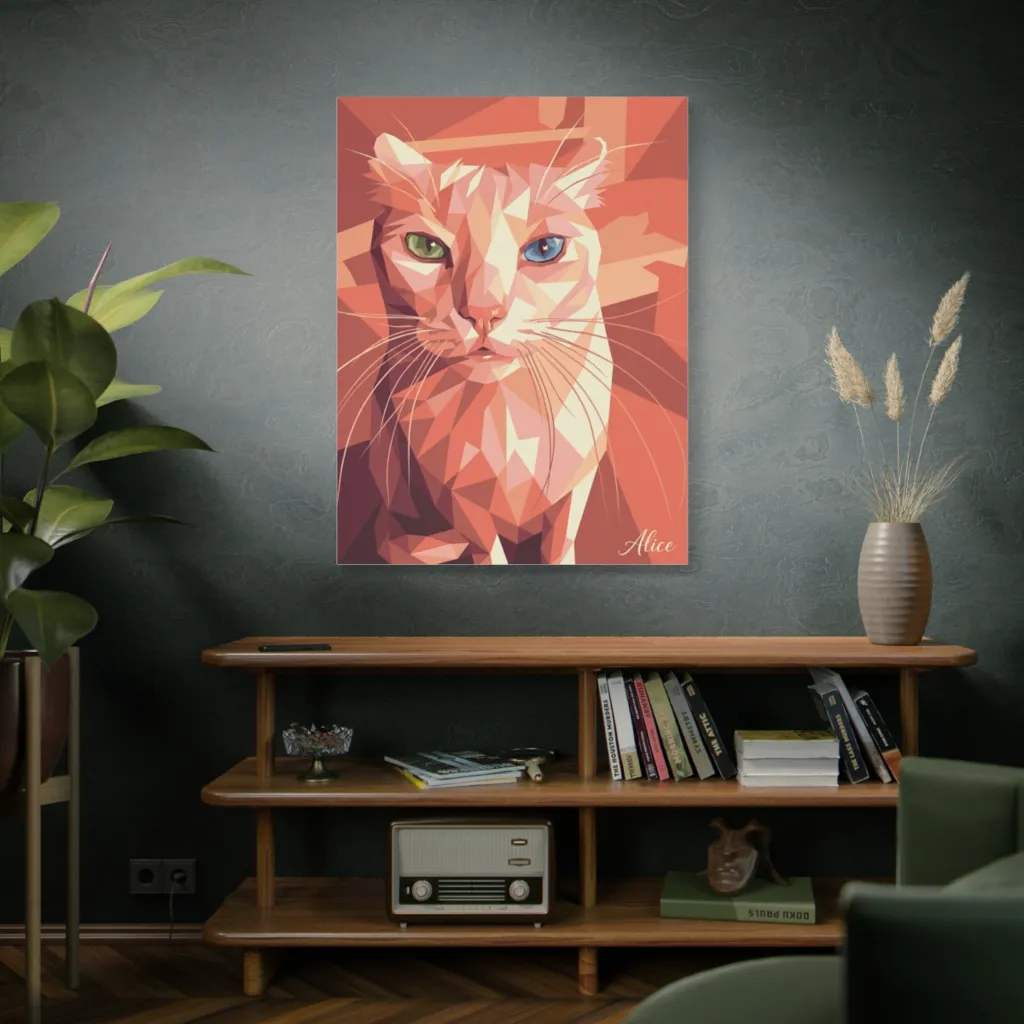 This striking low-poly portrait of a heterochromatic cat captivates with geometric warmth and a modern, enigmatic gaze.