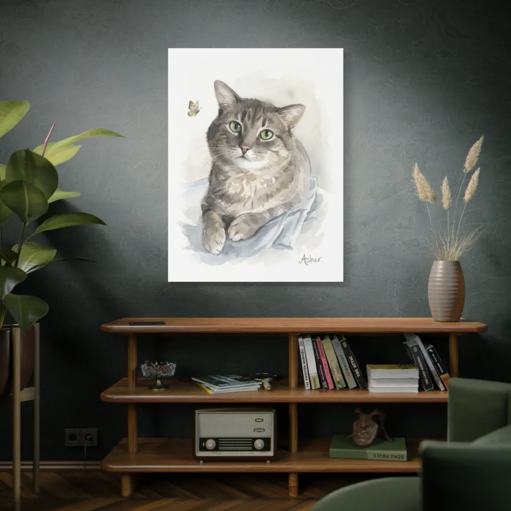 Asher's serene gaze, beautifully rendered in watercolor, belongs above a raw oak console in a sun-drenched reading nook. Pair with brushed brass accents and soft linen textures for an effortlessly chic and tranquil space.