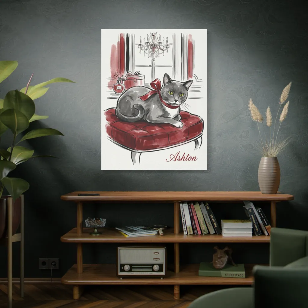 A chic watercolor sketch presents Ashton, a pampered feline monarch, luxuriating amidst opulent boudoir charm. Ashton clearly believes every day is a red-carpet event, especially when perched perfectly on his plush throne.