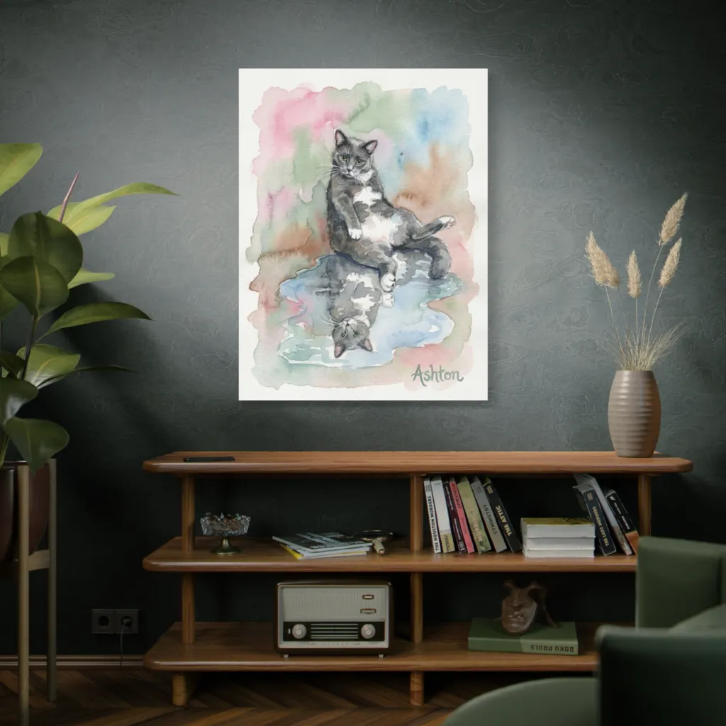 This piece masterfully merges traditional feline portraiture with a contemporary introspective narrative. The innovative reflection adds a bold, digital-age twist, pushing classic pet art boundaries.