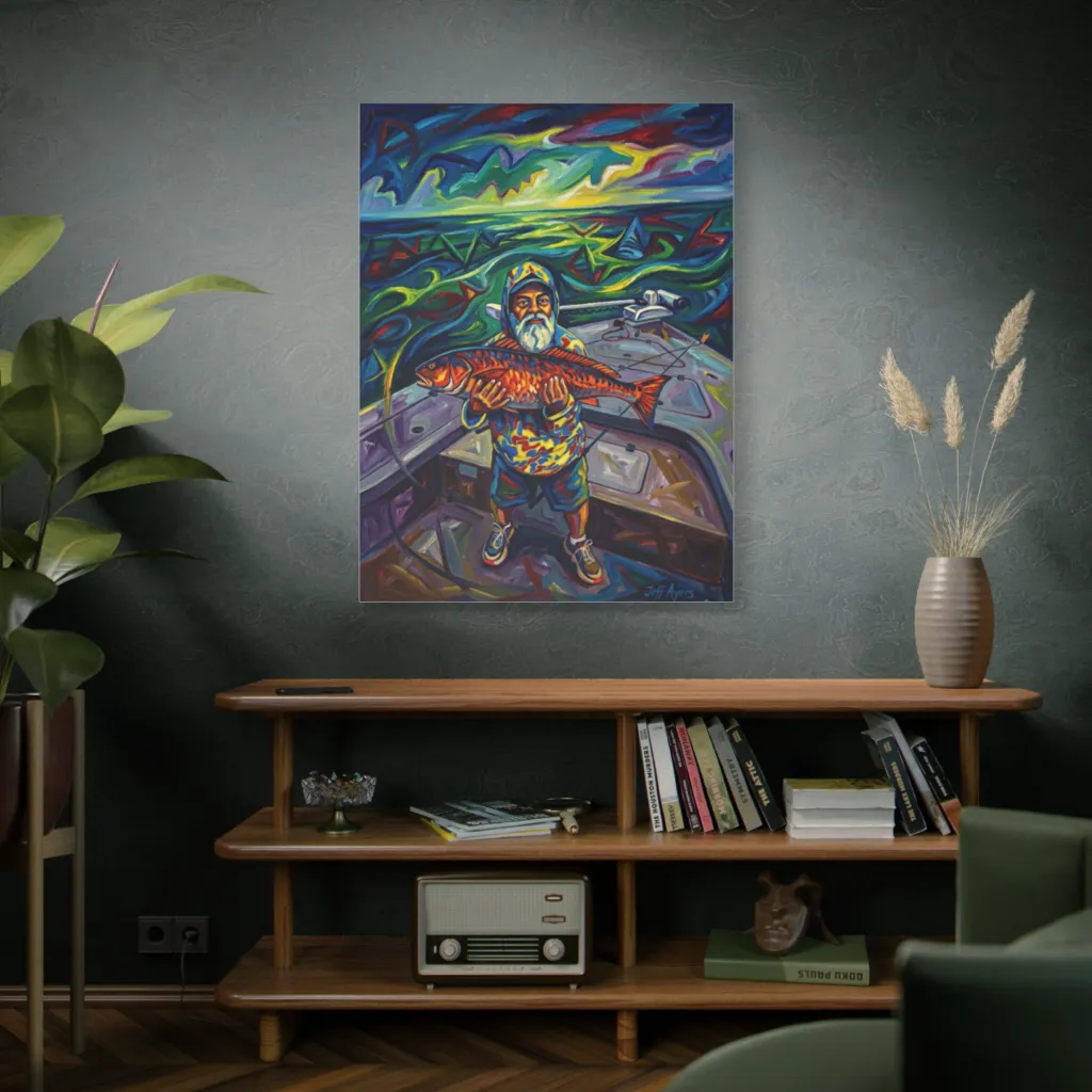 Bold, expressionistic strokes depict a jubilant angler and his vibrant catch against a swirling, electric seascape.