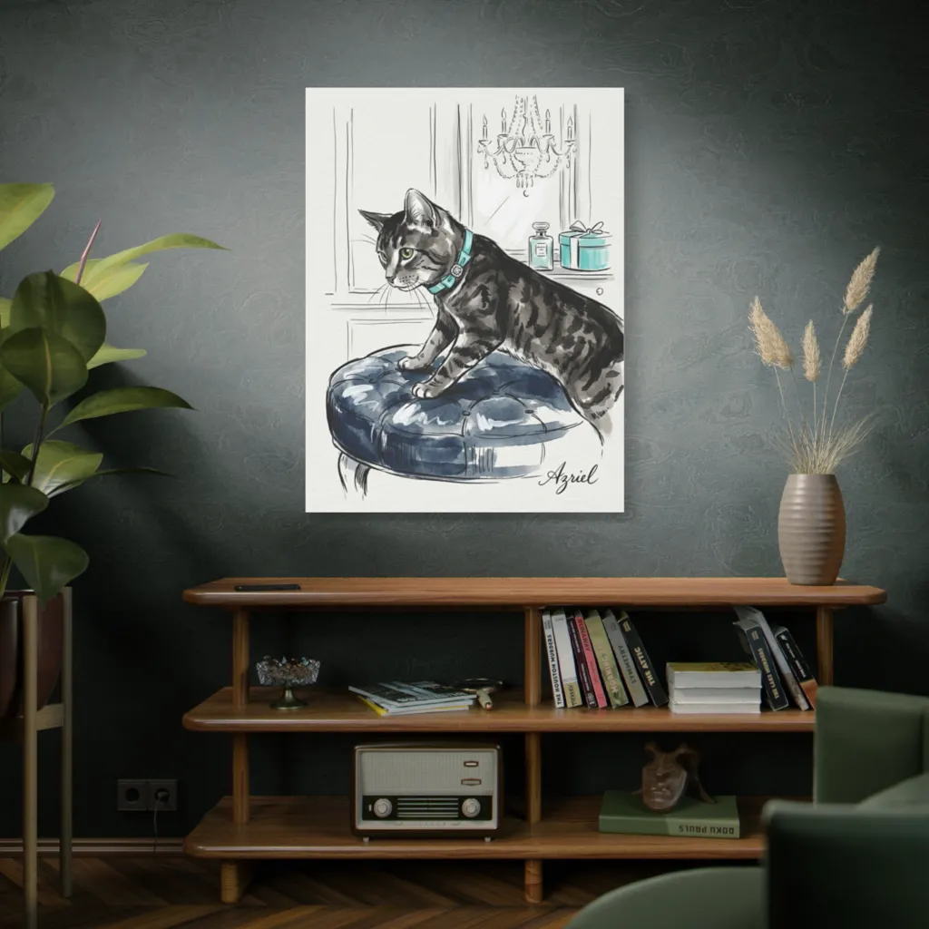 Azriel's discerning gaze commands this avant-garde study in tonal harmony. The juxtaposition of plush blue and crystal creates a visceral, evocative presence, a true masterpiece of feline majesty.