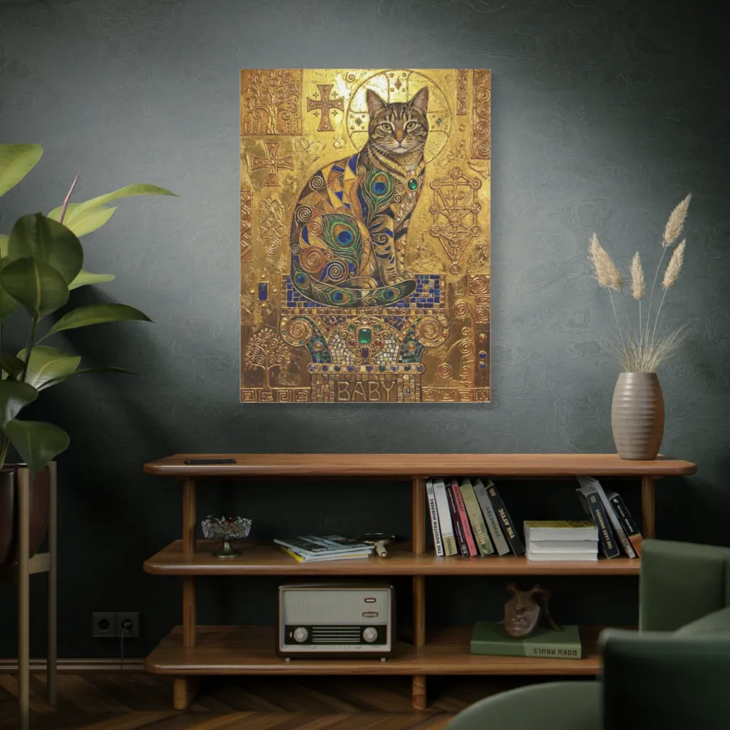 Baby's 'purr-fectly opulent gaze' truly reveals a regal soul. The Klimt-esque style highlights her unique, majestic character as a 'sacred sovereign'. Every golden detail speaks to her divine individuality, capturing pure feline adoration.
