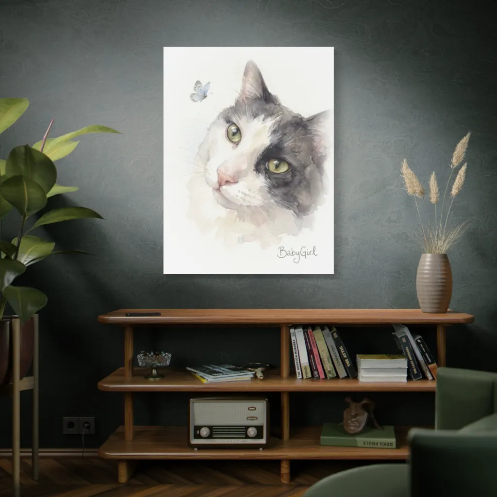 "BabyGirl's Butterfly Reverie" presents a masterful juxtaposition of feline grace and ethereal whimsy. The watercolor's tonal harmony, with its delicate brushwork, evokes a visceral, almost spiritual connection. Avant-garde for a pet portrait, truly a profound statement on being.