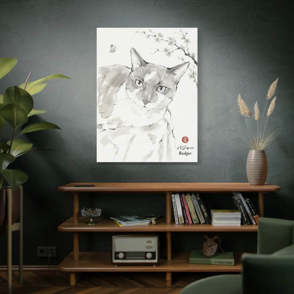 This digital sumi-e is a stunning innovation, seamlessly blending traditional feline portraiture with cutting-edge minimalist aesthetics. The bold, crisp lines and tranquil composition re-envision classic art for the modern screen. Truly groundbreaking!
