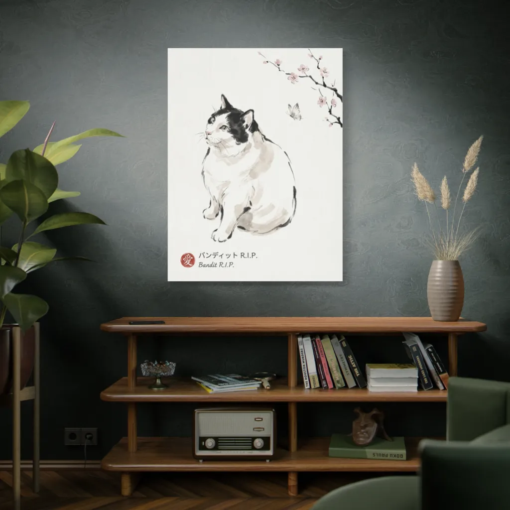 This serene sumi-e depicts a contemplative, plump cat under delicate cherry blossoms and a butterfly, evoking tranquil grace. Bandit R.I.P. keeps a watchful eye on that butterfly, surely plotting a pounce from cat heaven.