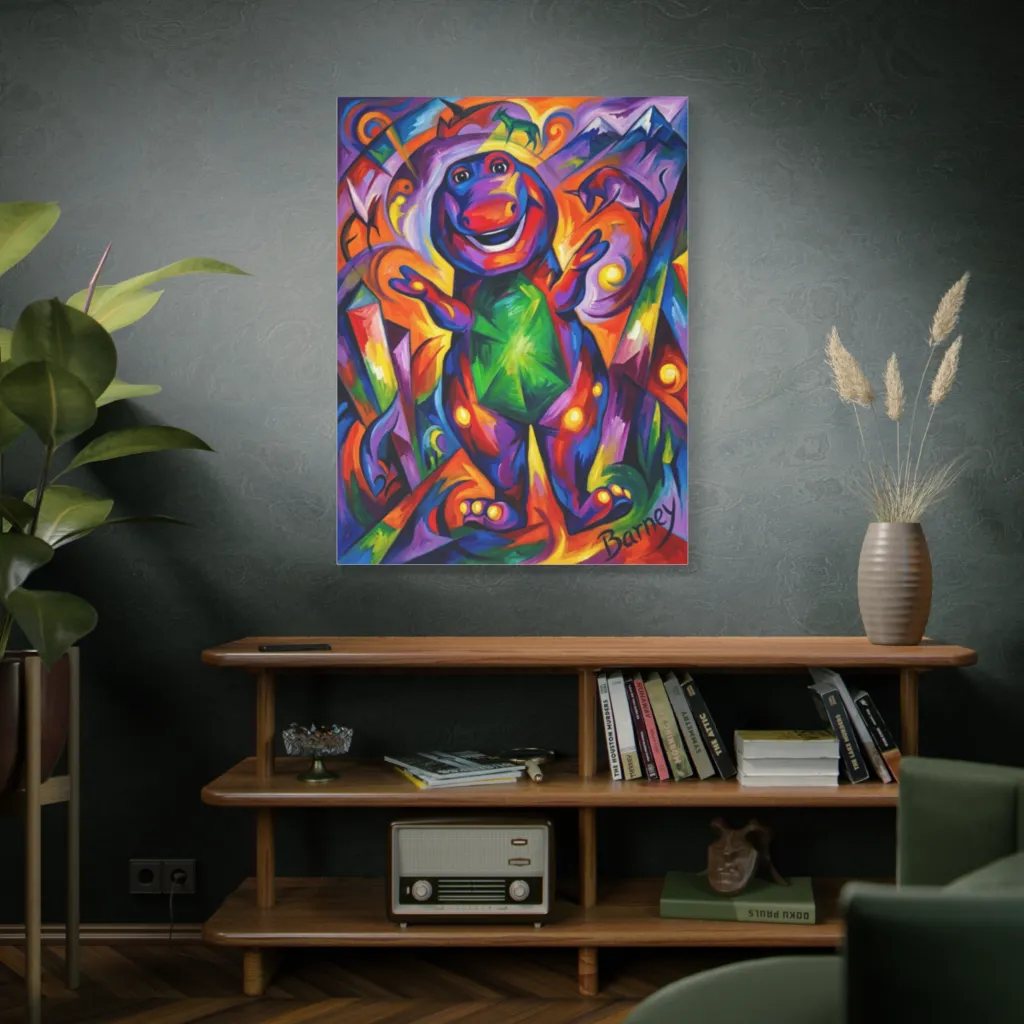 The vibrant, high-saturation palette, particularly the emeralds contrasting with warm accents, brilliantly captures Barney's unhinged joy. A masterclass in chromatic harmony and emotional resonance! Utterly delightful.