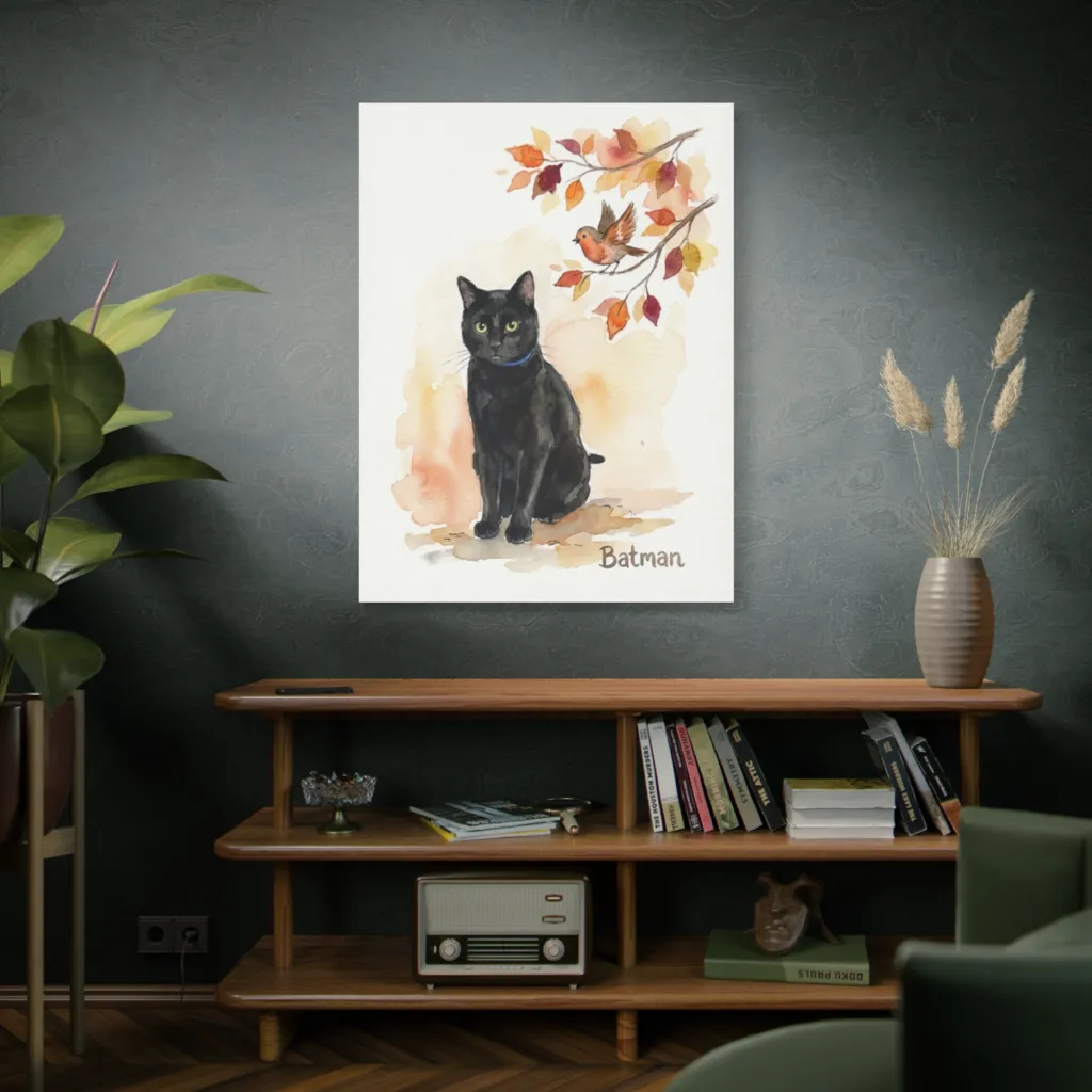 Batman's watchful yet tranquil gaze perfectly captures his readiness for adventure and his deep, sleek soul. The delicate watercolors truly reveal his unique feline essence, making him special.