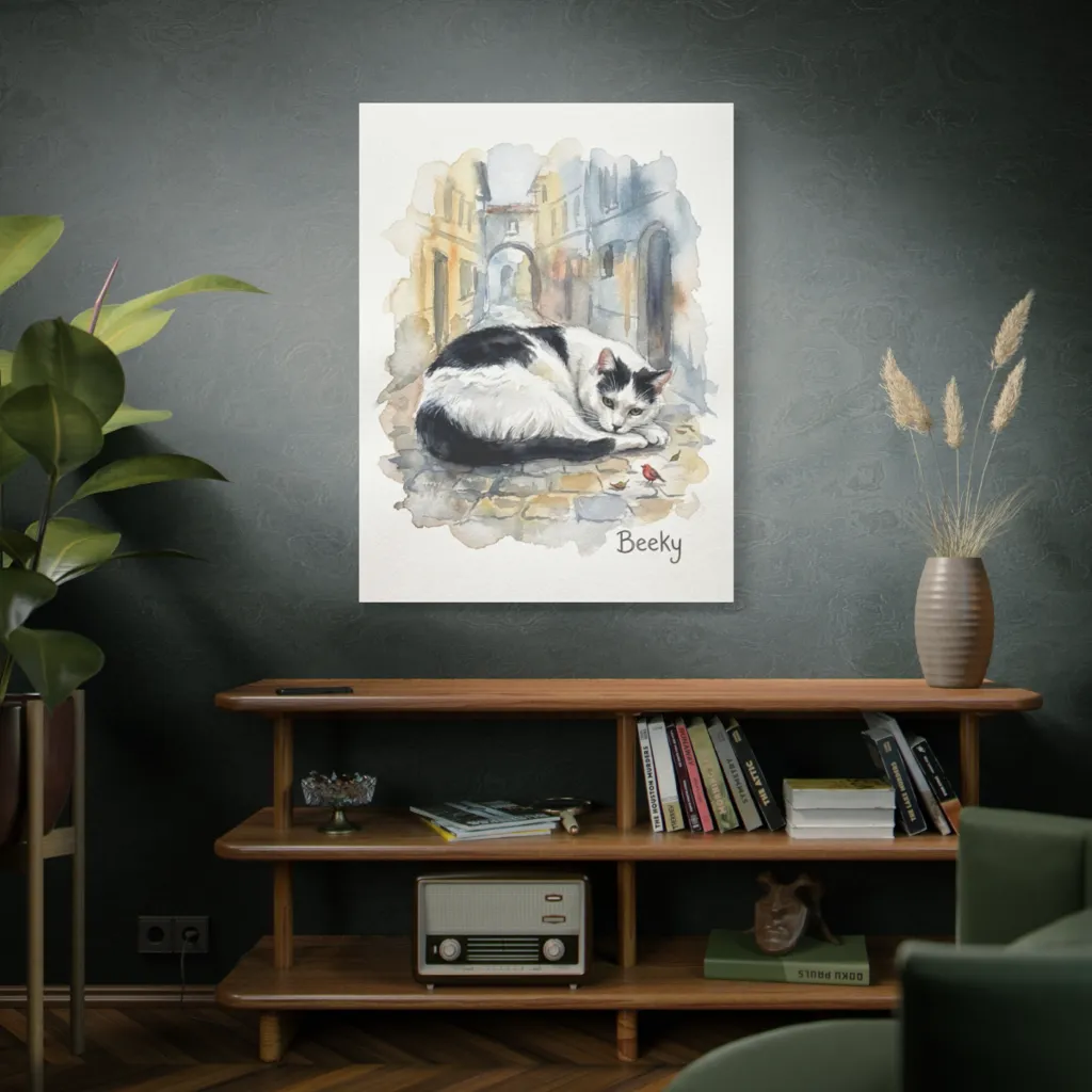 This piece brilliantly fuses traditional watercolor with a modern narrative. Beeky's feigned disinterest, digitally rendered in a sun-kissed alley, redefines contemporary pet portraiture. Bold, innovative storytelling!