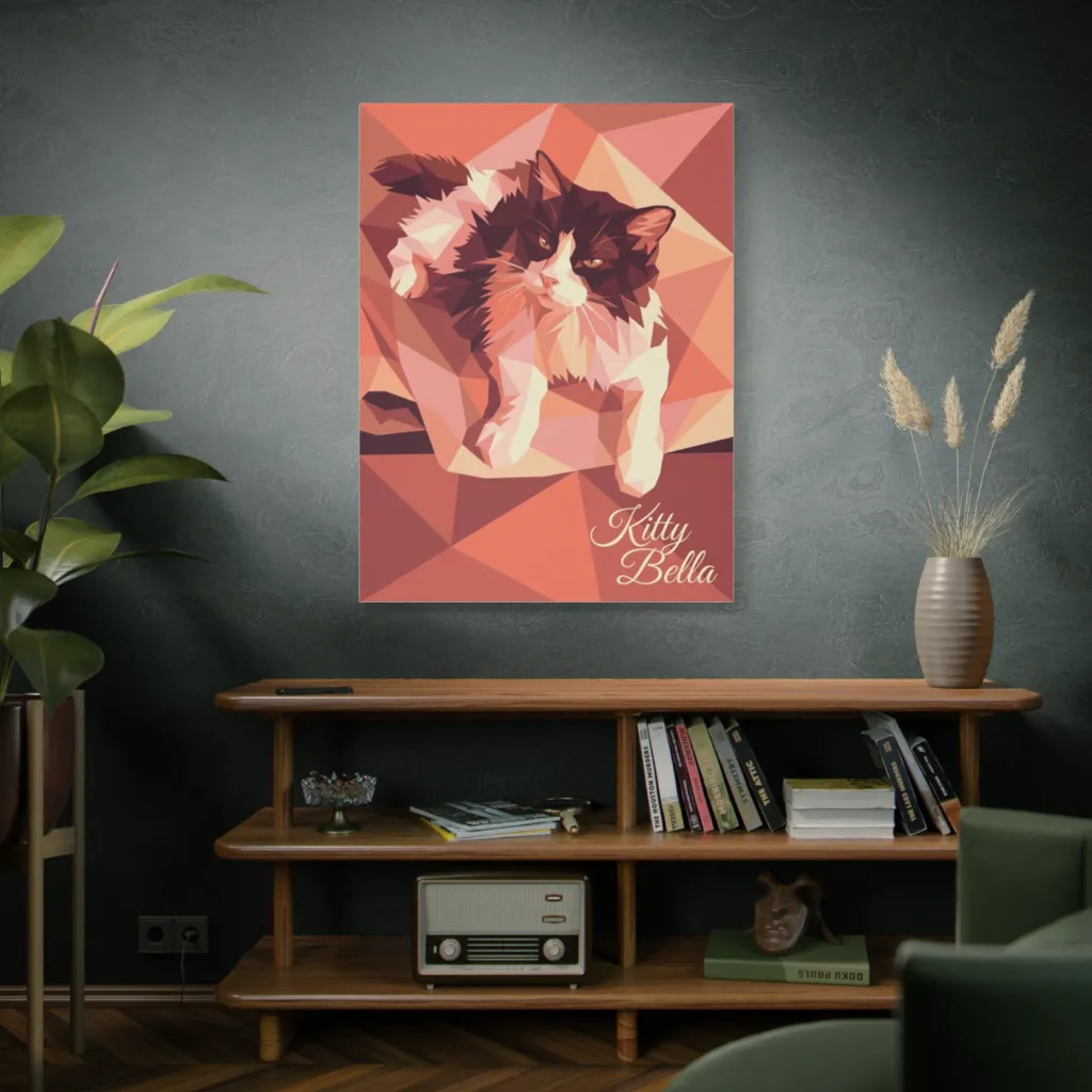 Bella's regal stance and cool composure truly shine through the geometric rendering, perfectly capturing her unique, sophisticated soul. This portrait exquisitely reveals the distinctive character of a feline monarch, making her special.
