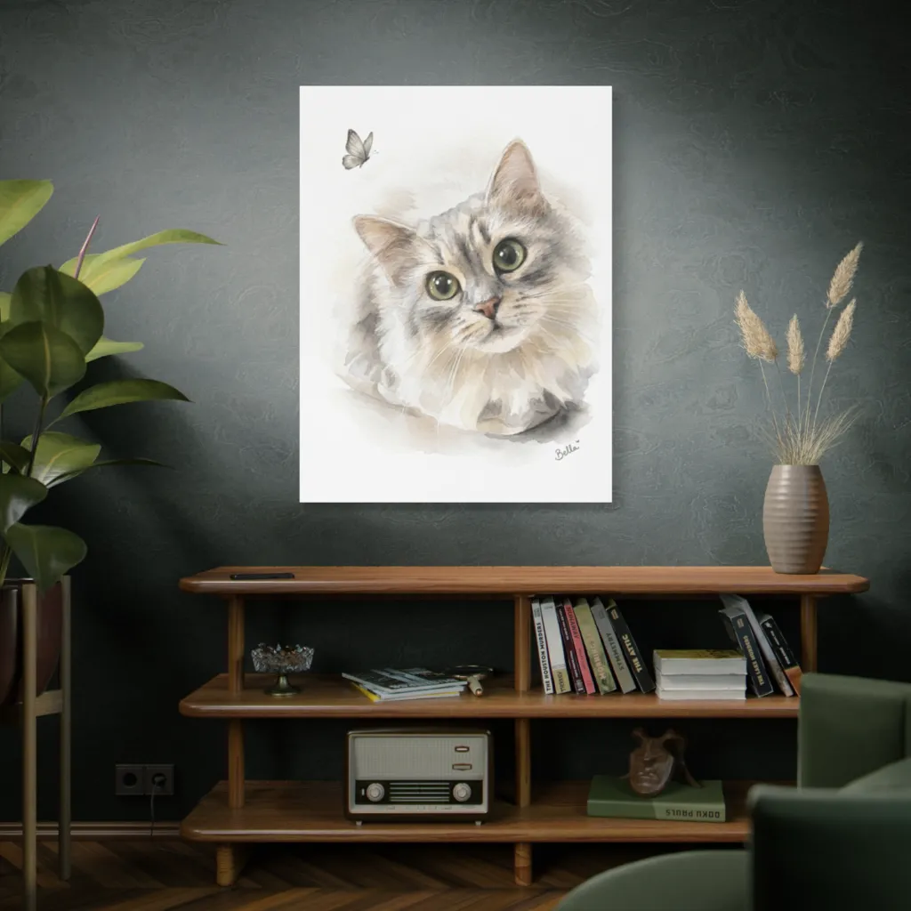 Bella's emerald eyes against warm fur create a vibrant complementary balance! The soft watercolor saturation beautifully captures whimsical curiosity, a chromatically harmonious palette that vibrates with feline charm. Delightful!