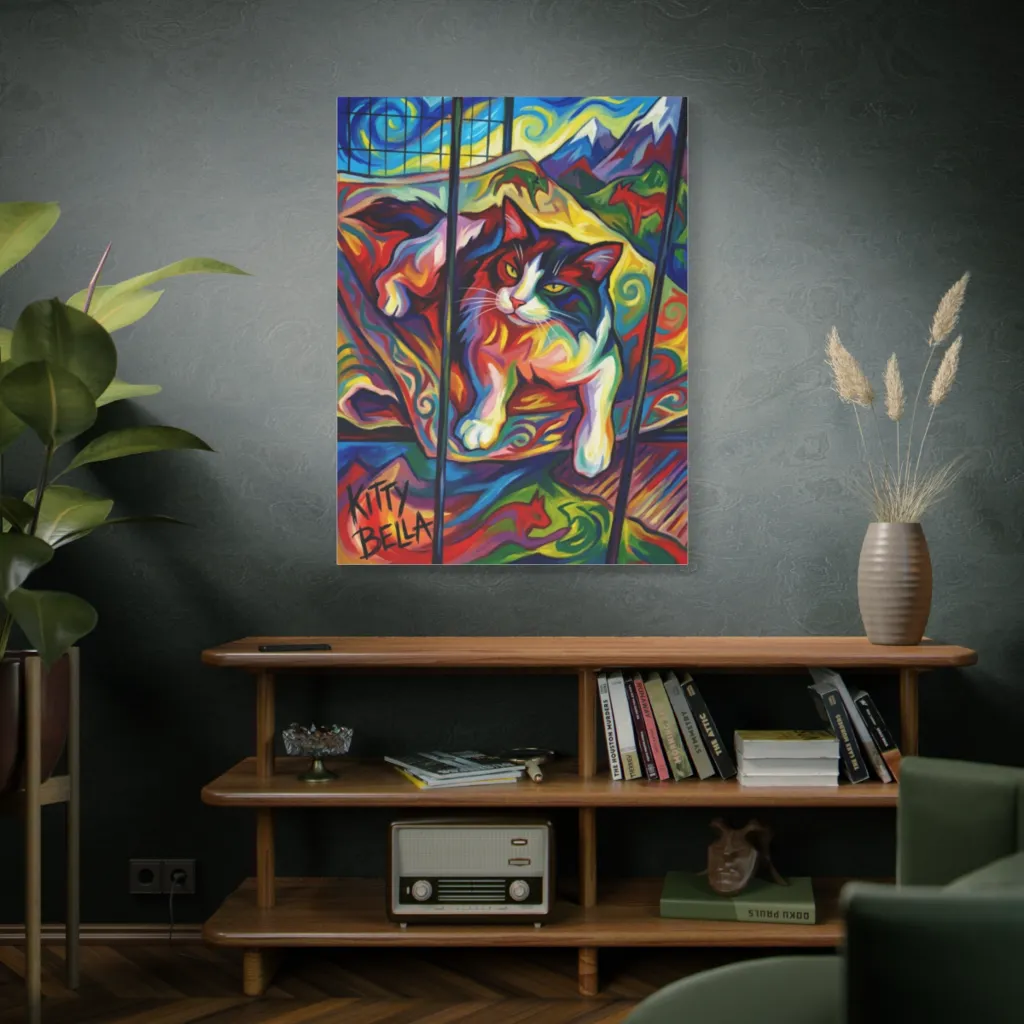 Bold, colorful brushstrokes capture a cubist cat peering from a window into a swirling, vibrant mountainscape, creating an energetic and whimsical mood.