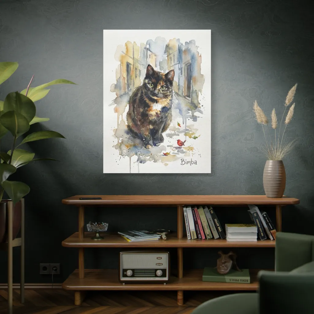 A fluid watercolor captures a keen-eyed tortoiseshell queen regally presiding over a whimsically splattered street, evoking understated charm. Bimba, the discerning tortie, seems to muse, "Is that cardinal a snack, or merely an artistic flourish?"