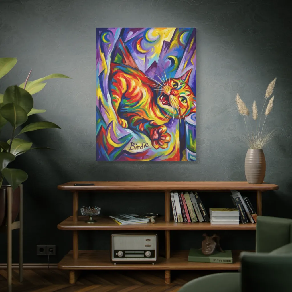 Birdie’s fauvist frenzy of sharp angles and explosive hues presents a visceral, avant-garde juxtaposition. The tonal disharmony brilliantly captures the feline’s roaring presence. A truly evocative masterpiece—worthy of its celestial subject.