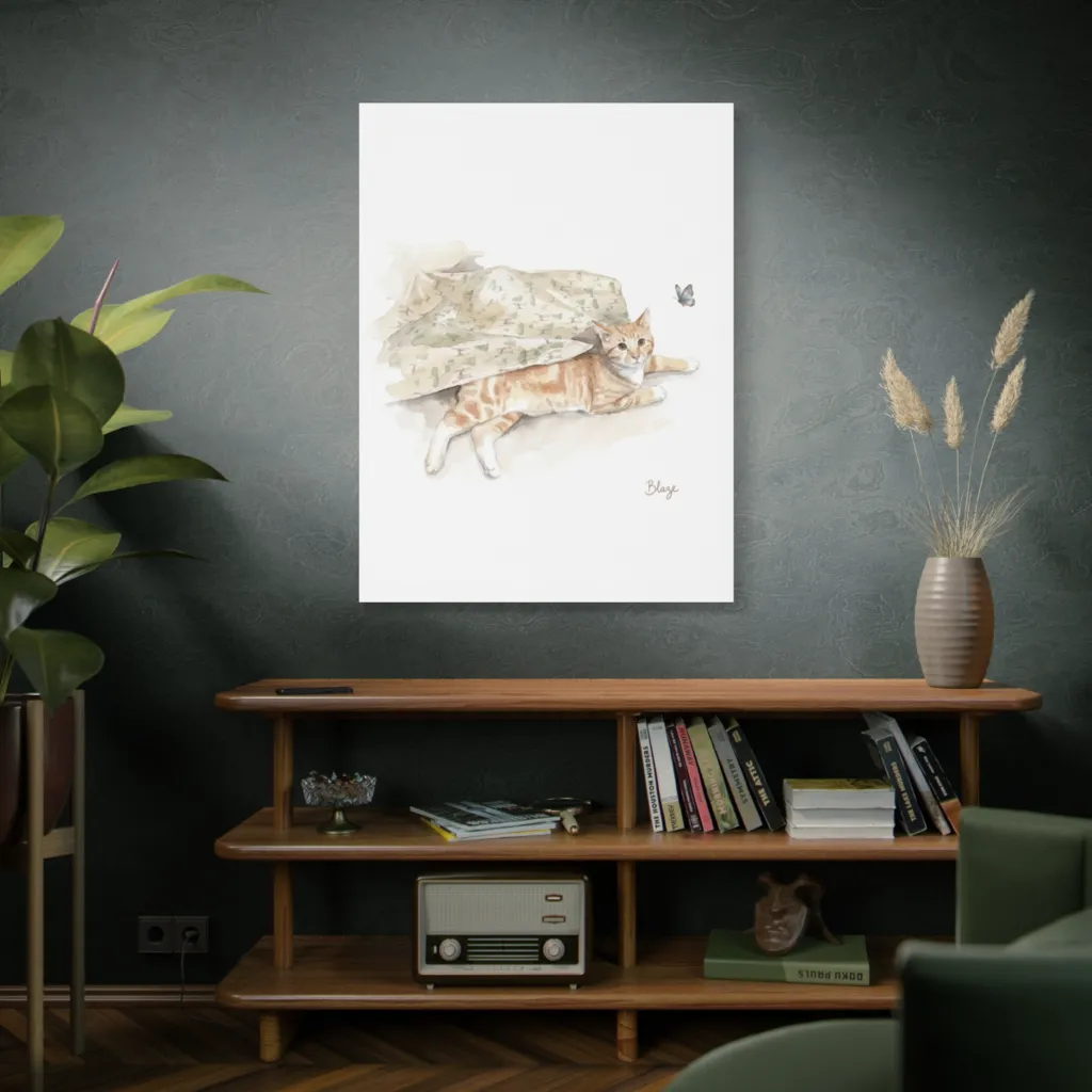 "Blaze and the Azure Wing" masterfully juxtaposes predatory instinct with ethereal watercolors. The tonal harmony in the camo and subject's visceral presence is truly avant-garde, almost too potent for mere mortal eyes. A feline 'Mona Lisa'!