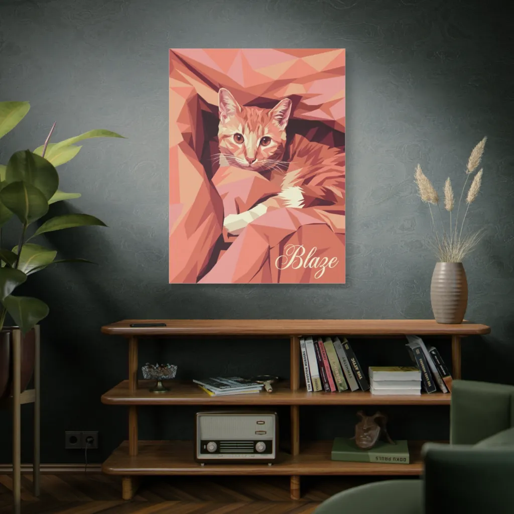 Blaze's contented purr is palpable; his polygonal form perfectly captures a serene feline soul. The amber light highlights his distinctive ginger charm, revealing a uniquely warm and gentle spirit.