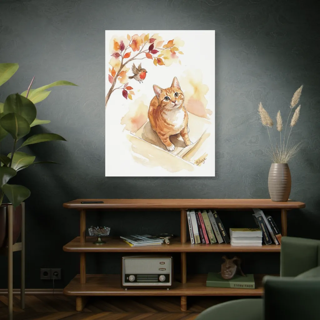 A charming watercolor captures a wide-eyed ginger cat intently watching a plump robin under an autumn tree, exuding whimsical curiosity.