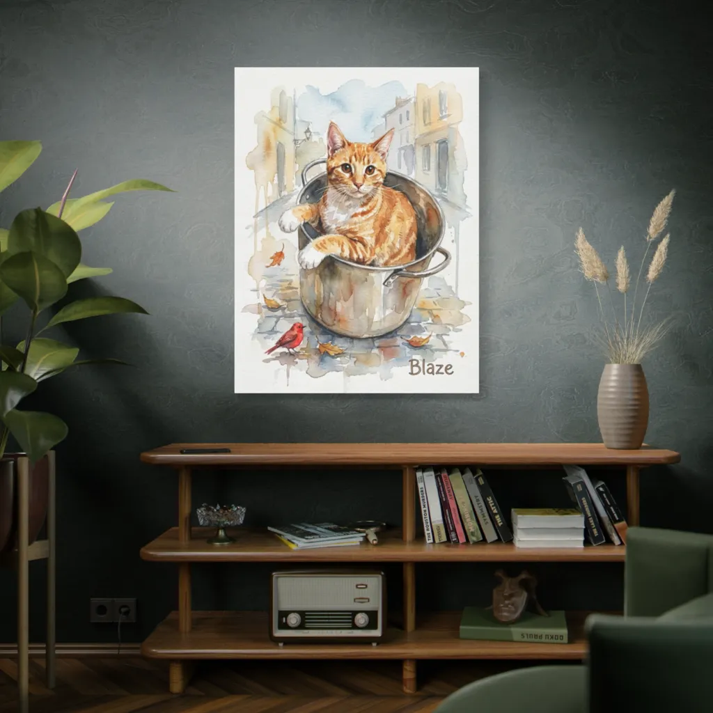 Blaze's curious expression and unique "pot seating" perfectly capture his playful, observant spirit. You feel his adventurous soul, a charming cat finding joy in the everyday. A truly special portrait.