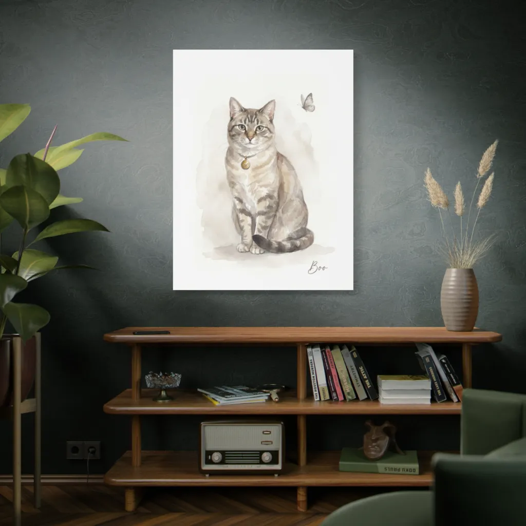 This watercolor innovatively bridges traditional pet portraiture with a contemporary, almost photographic, moment. The delicate rendering of Boo's focus offers a fresh, intimate perspective on feline grace.