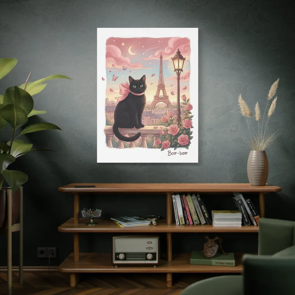 This charming, pastel illustration captures a chic black cat in a Parisian dreamscape, evoking a sweet, whimsical romance. Boo-boo clearly believes every cat needs a pink bow and a Parisian balcony for purr-fectly romantic evenings.