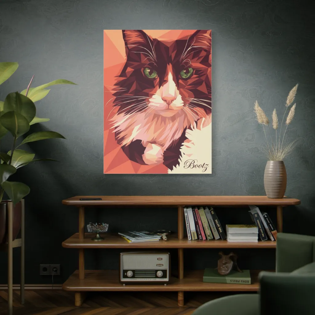 This sharp, polygonal portrait of a captivating feline boasts emerald eyes and a delightfully majestic presence.